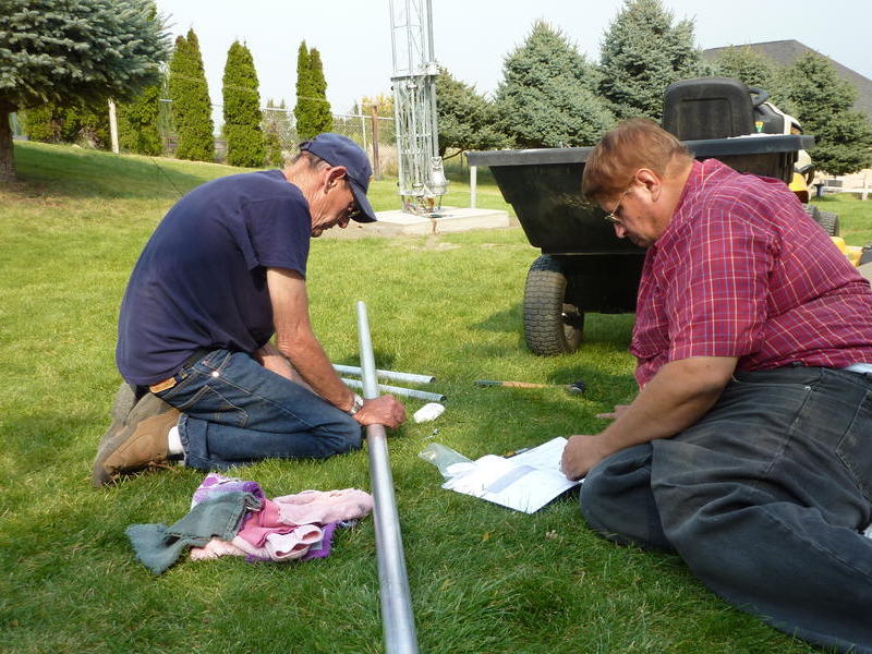 Peter Rosenberg (AC7SB) from Fall City WA joins the antenna assembly team. Steve (WA7DUH), Peter and Gary (W7TYQ) apply anti-sieze compound to the staddles that will be used for one of the Return Element fixtures. Liberal use of anti-sieze compound is critical because of the many dissimilar metals used in both the antenna and hazer (aluminum, stainless steel hardware and galvanized steel.)
